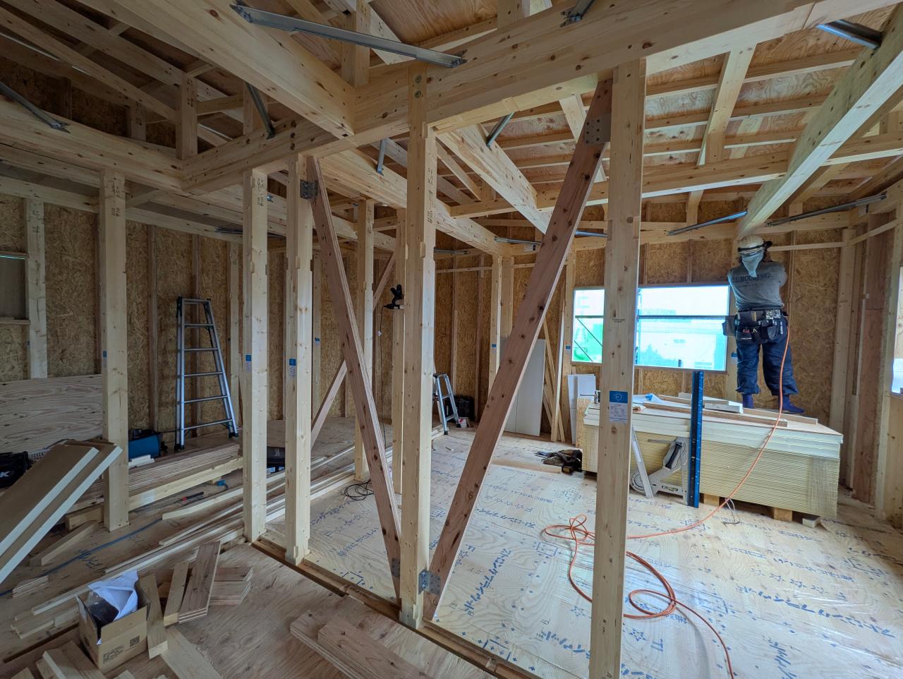 S様邸では、構造材の施工が進み、現在は構造用合板のOSBと断熱材ファースボードの施工を行っています。