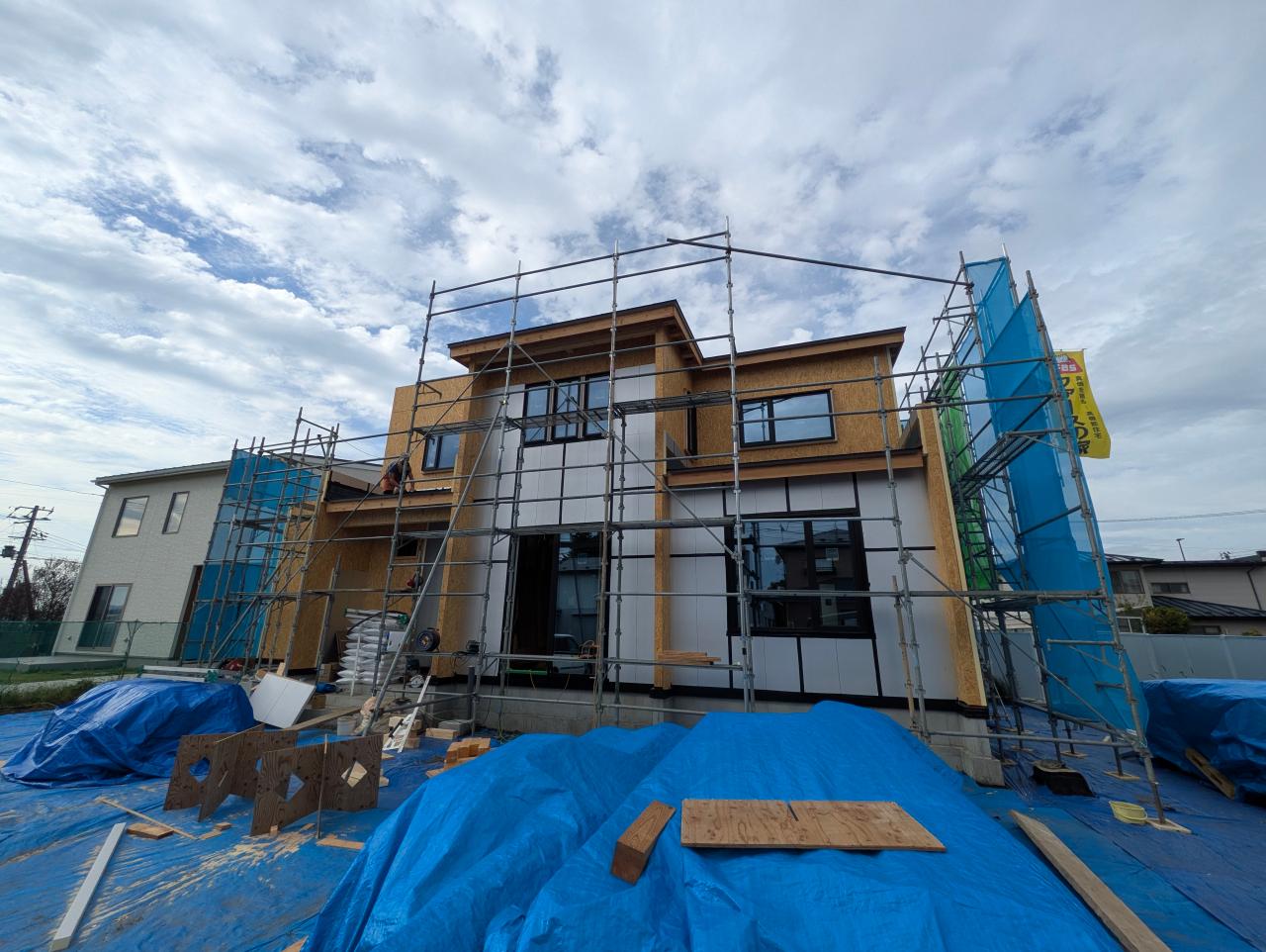外観:OSB合板を施工しています。外張り断熱材のFASボードを重ねて貼っていきます。