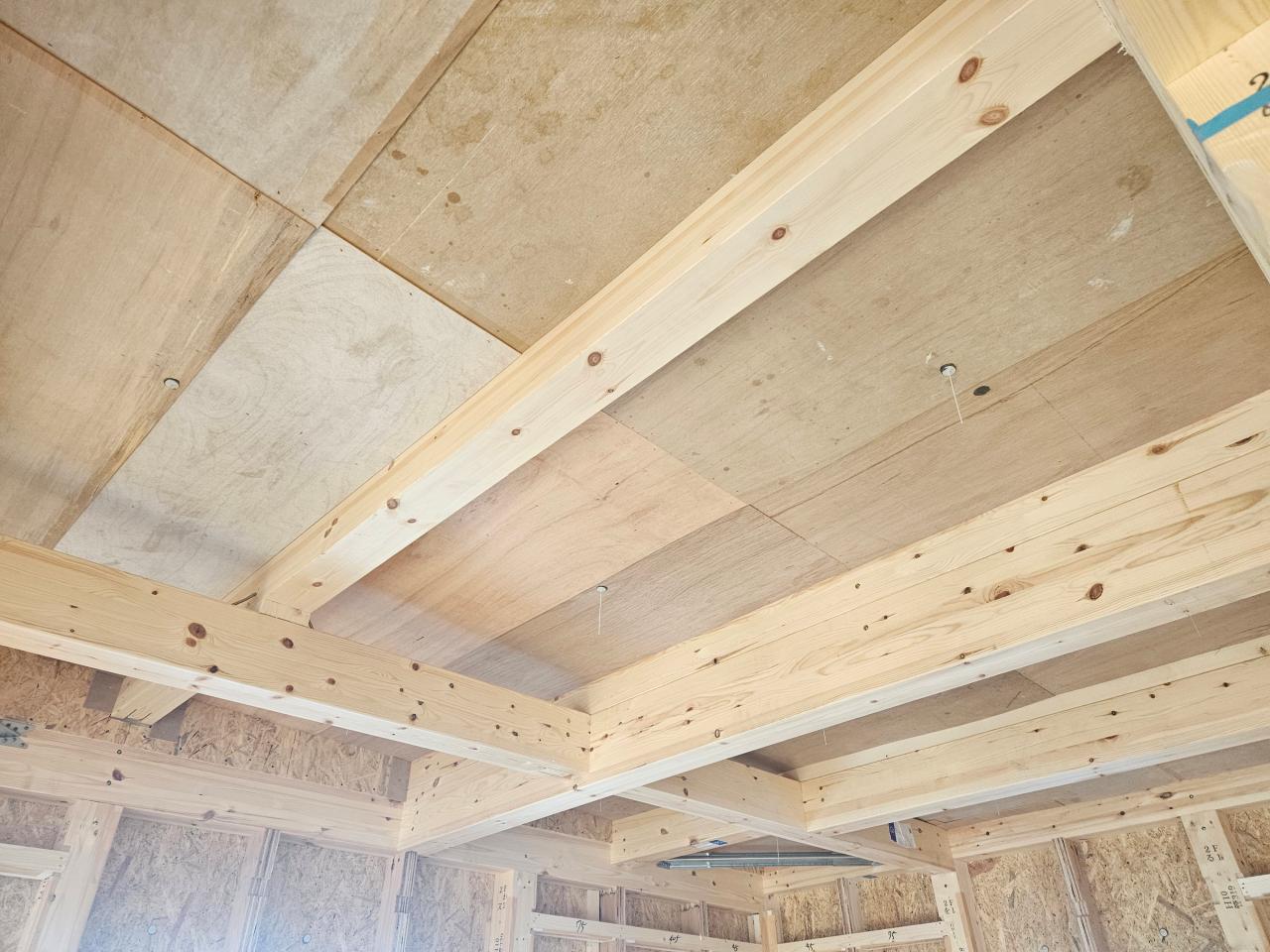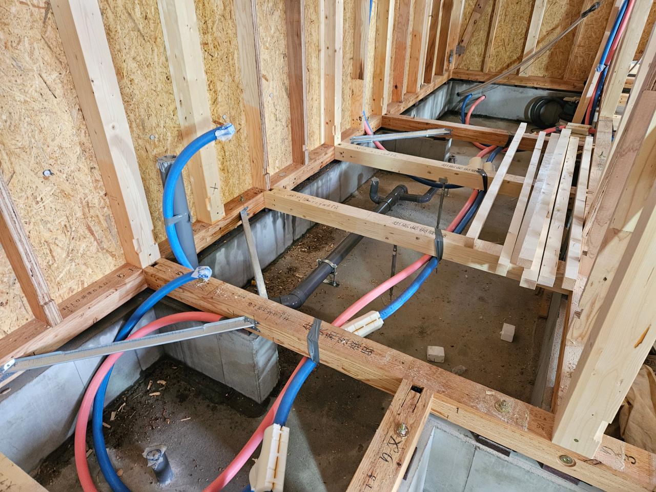 基礎周りの掃除や給排水の配管工事を行い、屋根面の下地施工も完了しました。